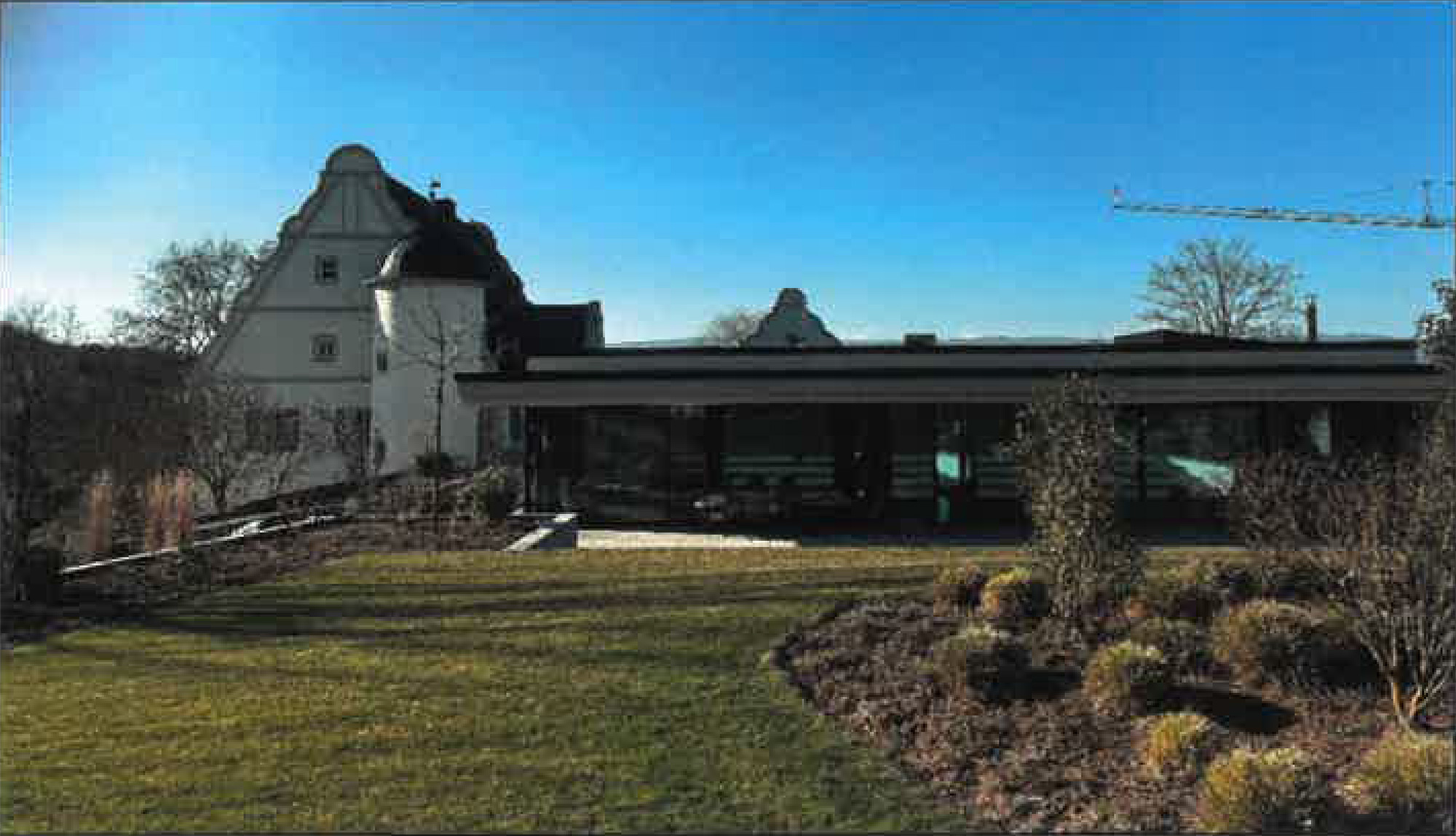 Abbruch eines Wirtschaftsgebäudes im eklektizierenden Stils von 1950 und Neubau eines EFH Pavillon der sich in den historischen Kontext der Schlossmühle einfügt.